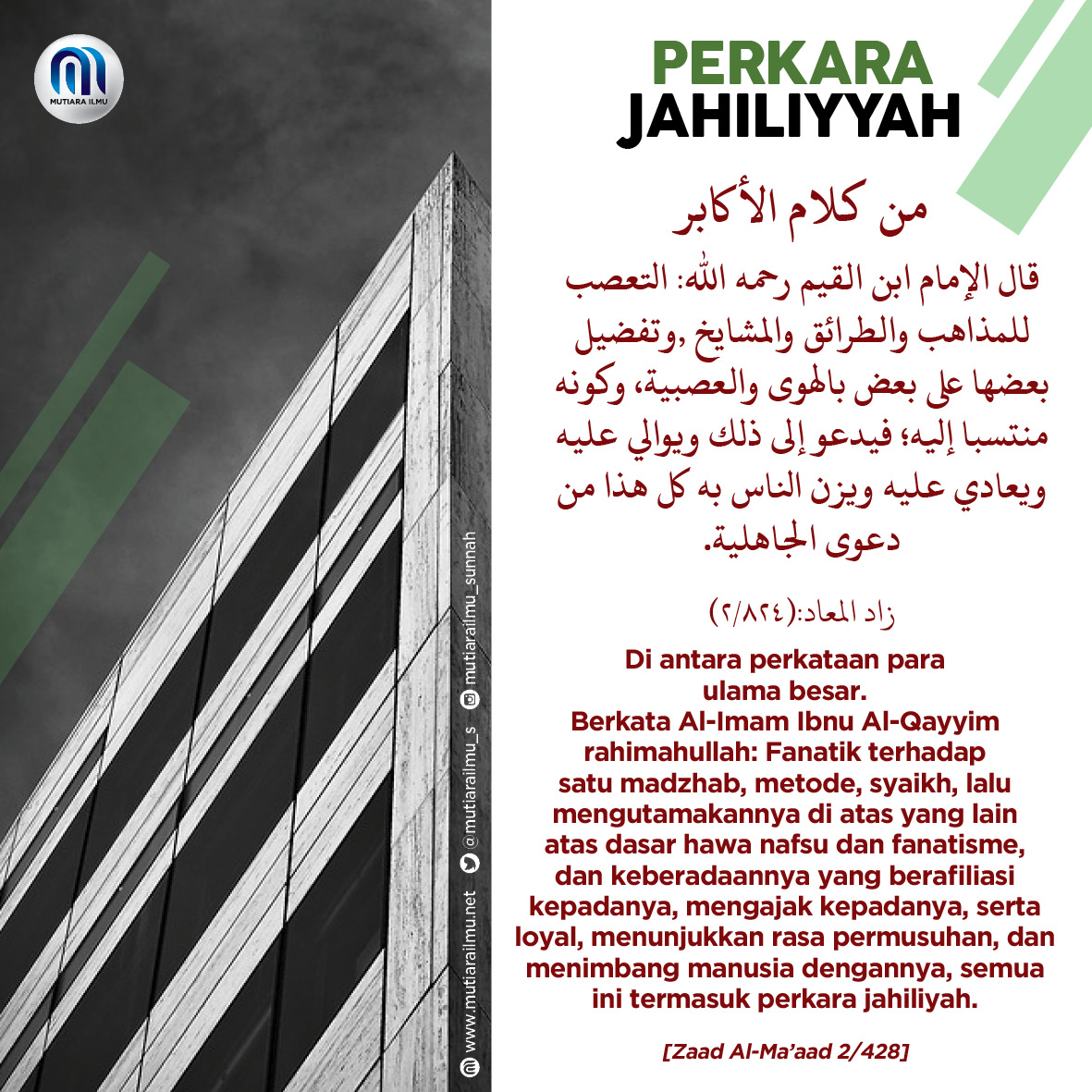 Berkata Al-Imam Ibnu Al-Qayyim rahimahullah: Fanatik terhadap satu madzhab, metode, syaikh, lalu mengutamakannya di atas yang lain atas dasar hawa nafsu dan fanatisme, dan keberadaannya yang berafiliasi kepadanya, mengajak kepadanya, serta loyal, menunjukkan rasa permusuhan, dan menimbang manusia dengannya, semua ini termasuk perkara jahiliyah.