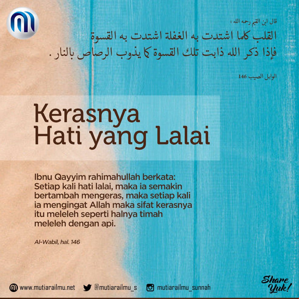 Setiap kali hati lalai, maka ia semakin bertambah mengeras, maka setiap kali ia mengingat Allah maka sifat kerasnya itu meleleh seperti halnya timah meleleh dengan api.