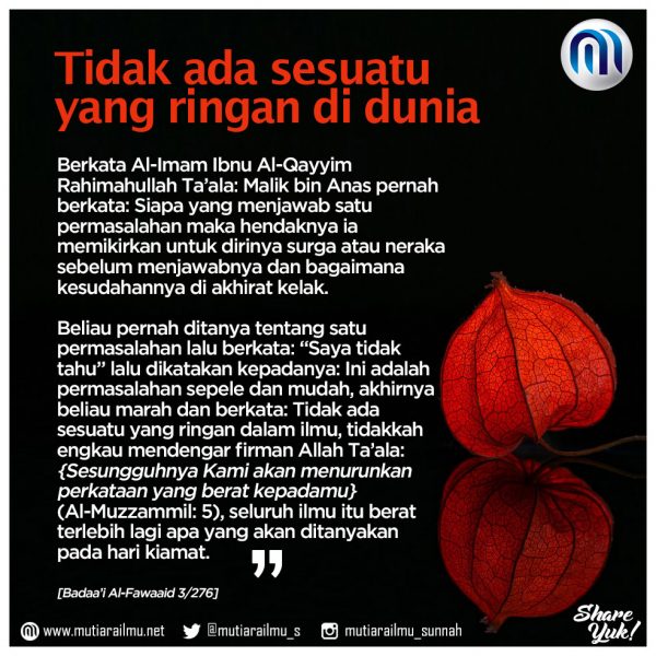 Berkata Al-Imam Ibnu Al-Qayyim Rahimahullah Ta’ala: Malik bin Anas pernah berkata: Siapa yang menjawab satu permasalahan maka hendaknya ia memikirkan untuk dirinya surga atau neraka sebelum menjawabnya dan bagaimana kesudahannya di akhirat kelak.